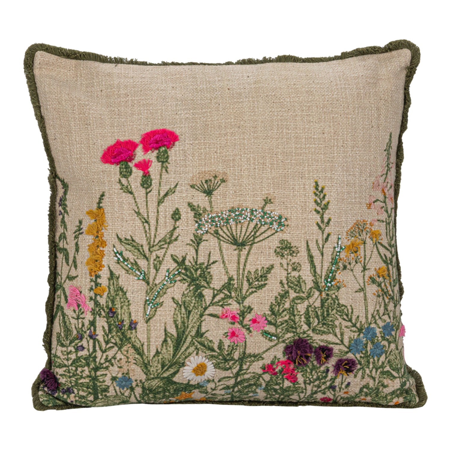 Catalog Name: 18" Square Cotton Slub Printed Pillow w/ Flowers, Embroidery, Beads & Eyelash Fringe, Multi Color