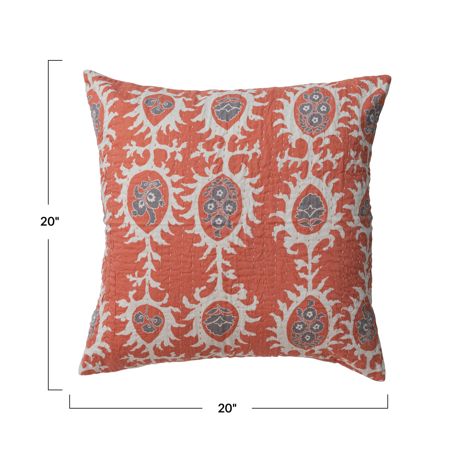 Catalog Name: 20" Square Cotton Voile Printed Pillow w/ Suzani Pattern, Hand-Embroidered Kantha Stitch & Chambray Back, Natural, Grey & Orange Color