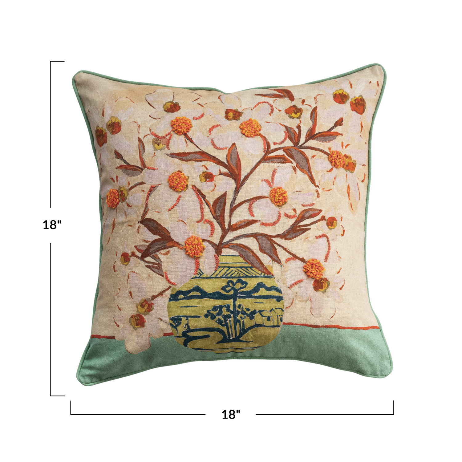 Catalog Name: 18" Square Cotton Blend Printed Pillow w/ Flowers in Vase, Embroidery & Piping, Multi Color ©