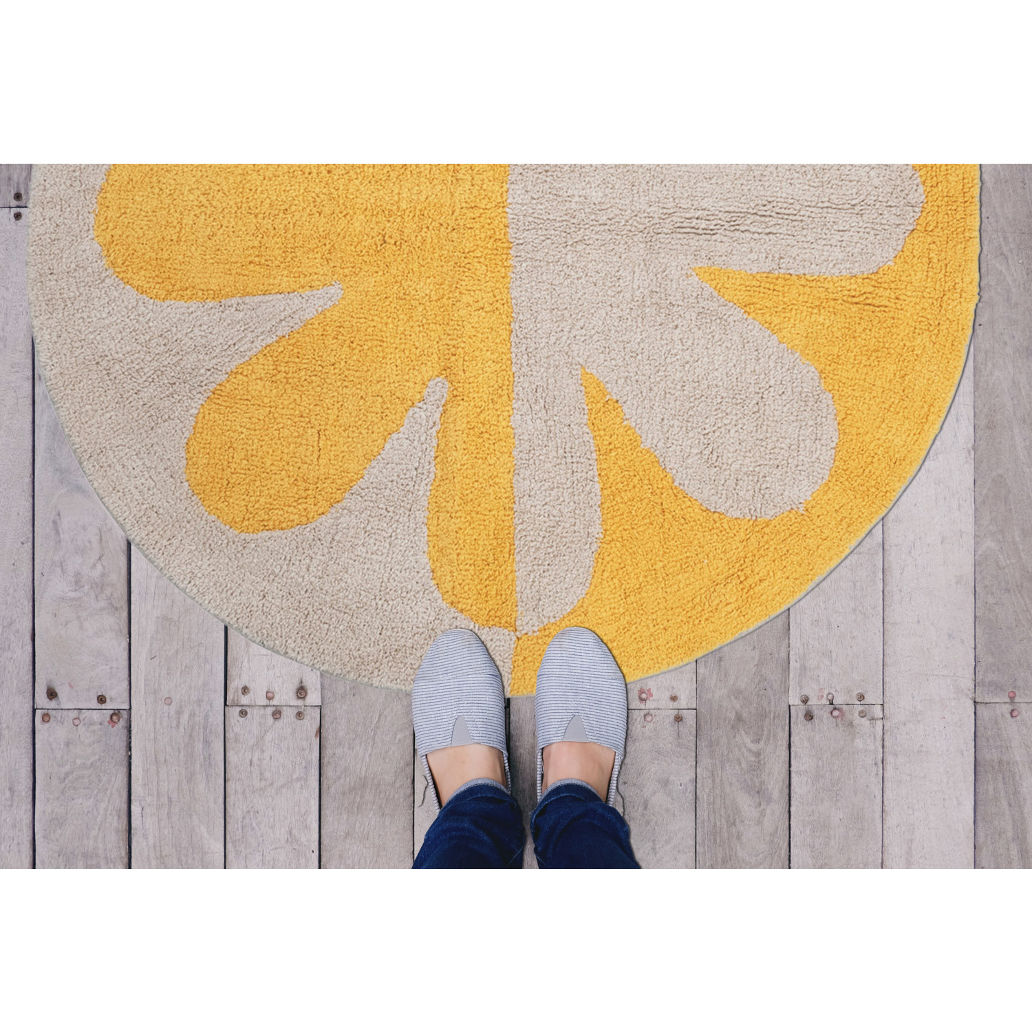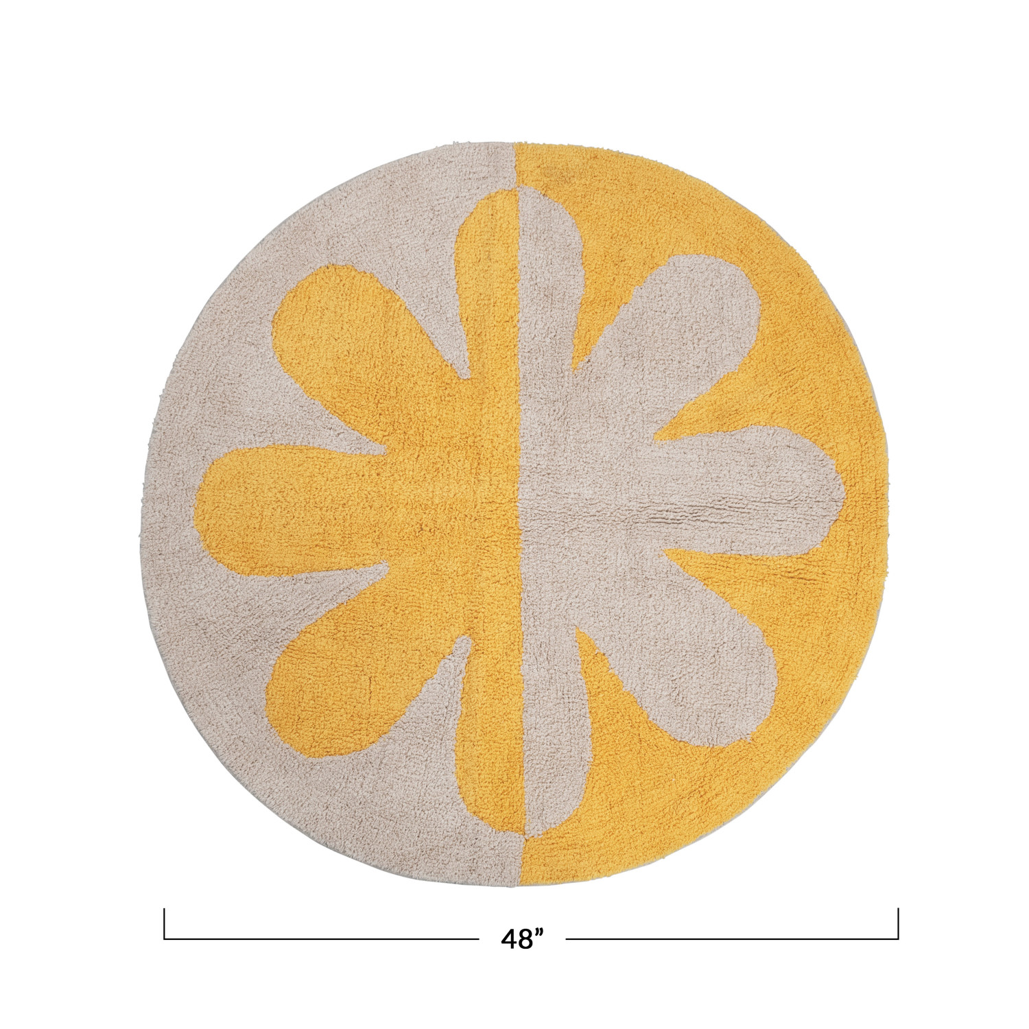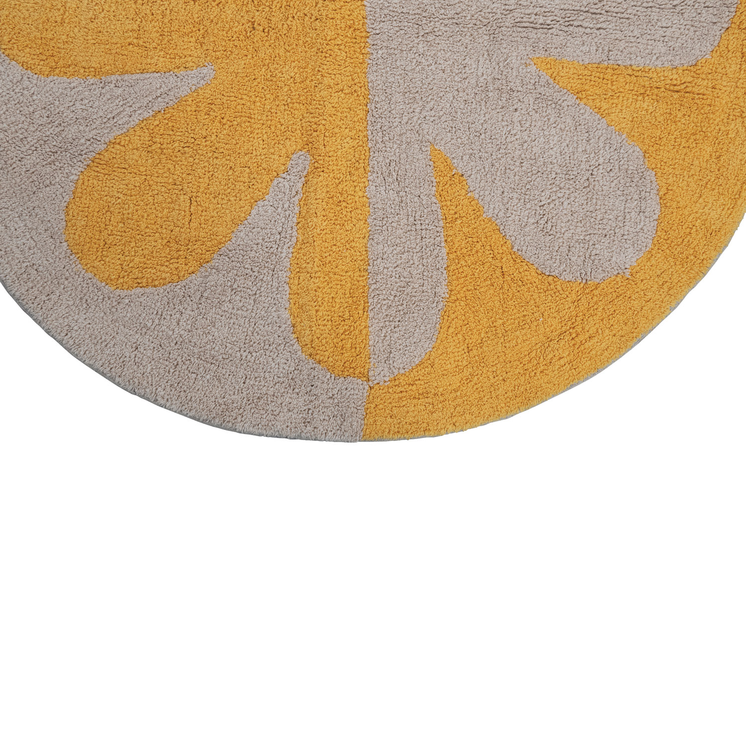 This playful rug showcases a bold, 2-tone floral design on soft tufted cotton. Cream and yellow tufted cotton rug with flower. Spot Clean Only. 97% Cotton, 3% Other Fibers.